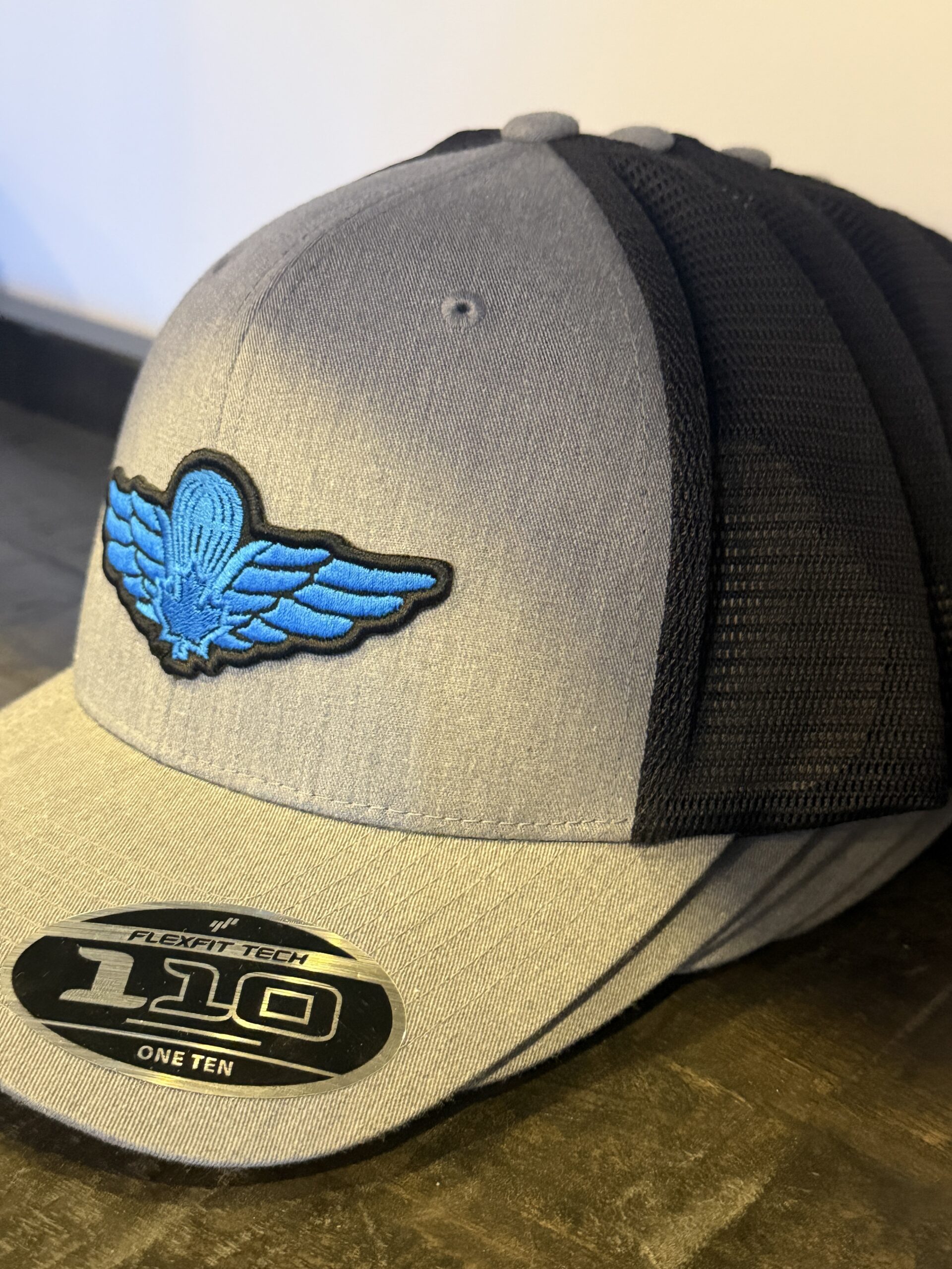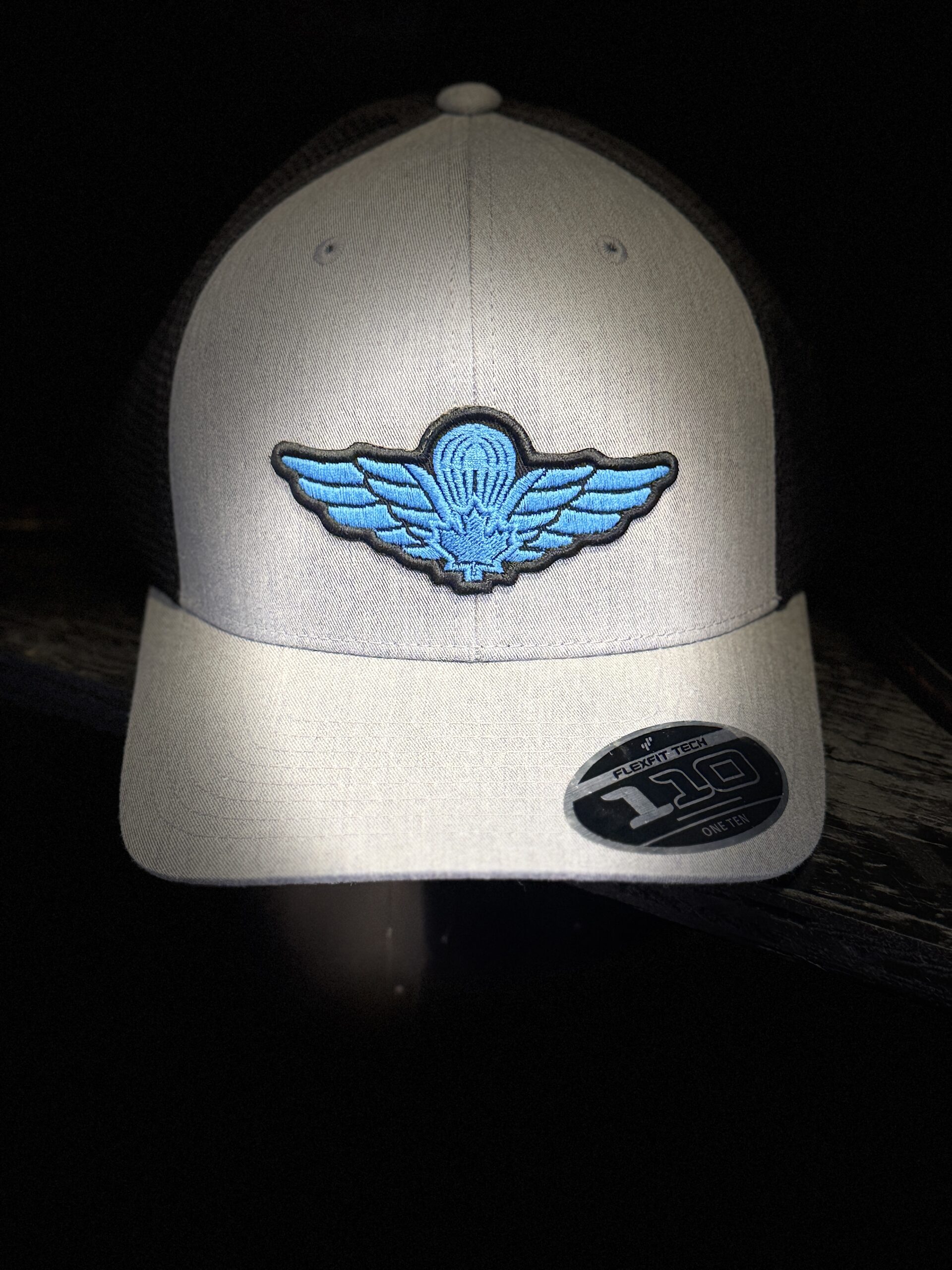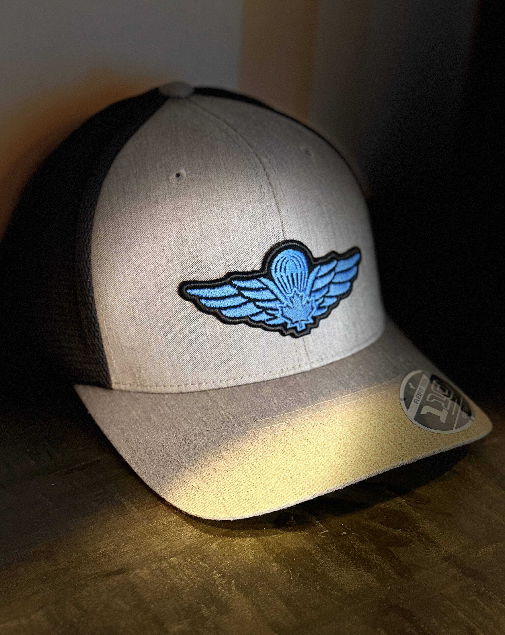 This FlexFit snapback features a structured grey front with black mesh trucker-style backing for breathability and all-day wear. A bold blue airborne insignia patch stands front and center — clean, sharp, and unmistakable.