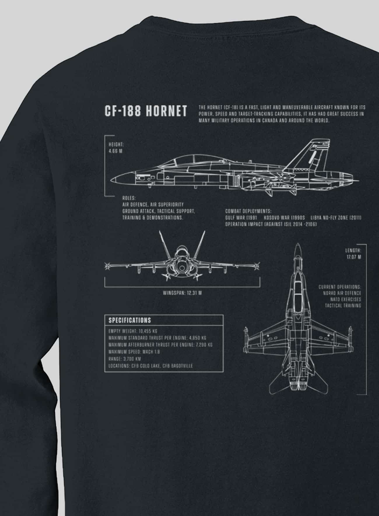 Engineered for dominance and built to defend the North, the CF-18 Hornet has been a cornerstone of Canadian air defence since the 1980s. This blueprint-style long sleeve t-shirt highlights the aircraft’s design and capabilities, celebrating the legacy of a fighter jet that stood watch over Canada and beyond.