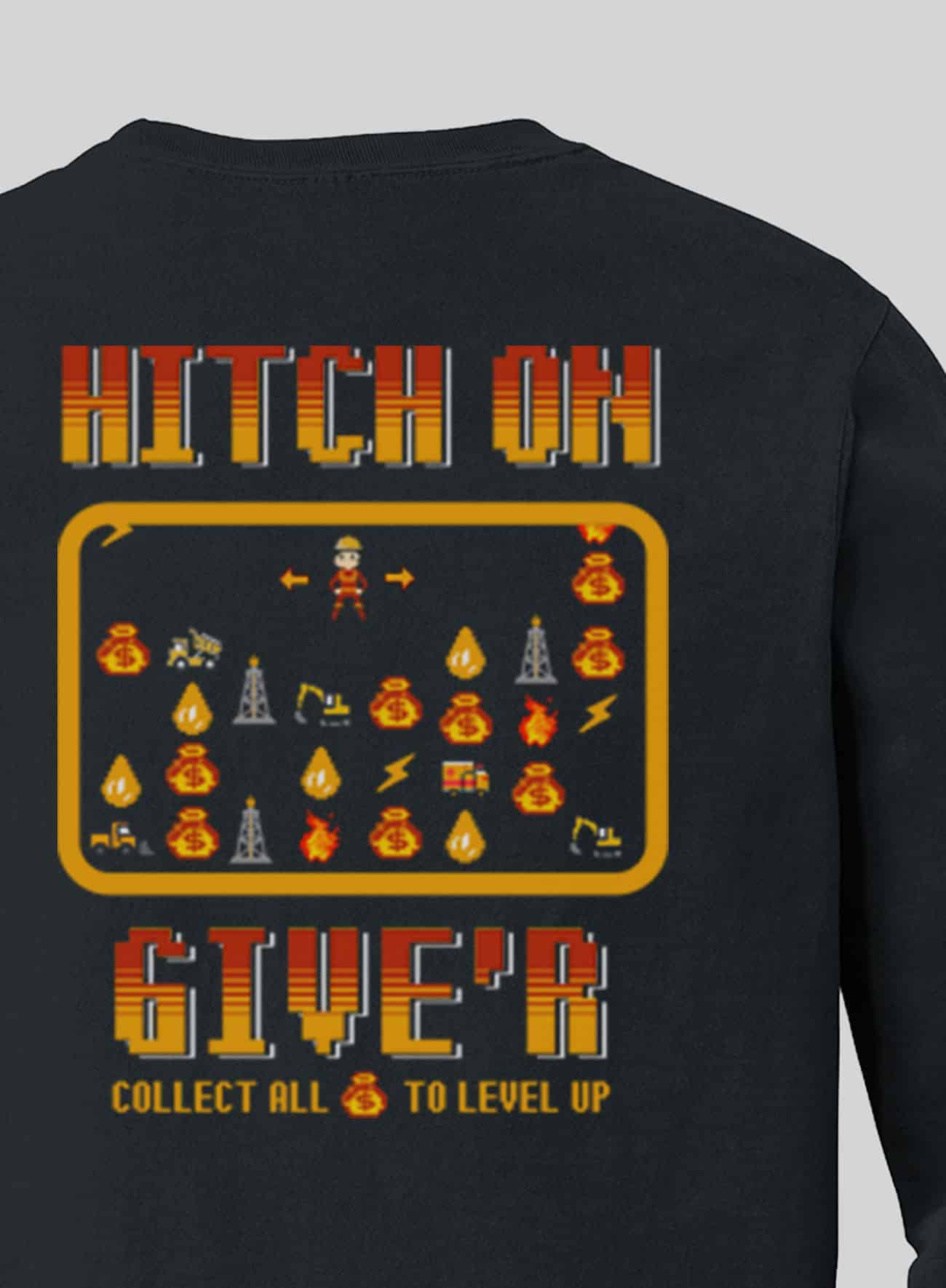 Our Hitch On heavy weight long sleeve t-shirt takes its inspo straight from classic 80s arcade cabinets—bold pixels, simple rules, and high-stakes fun—reimagined for the construction and oilfield world.