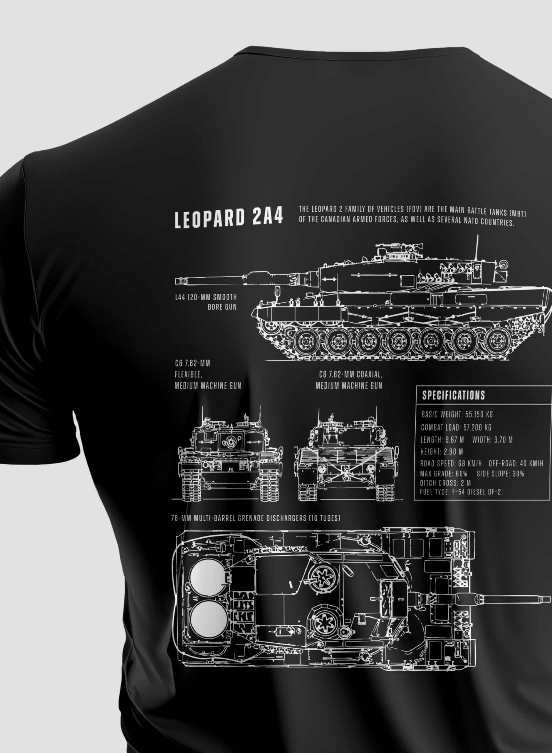 Showcase one of the world’s most respected main battle tanks with this detailed Leopard 2A4 blueprint T-shirt. Precise front, back, side, and top-view line diagrams highlight the engineering and raw power behind the platform, with vehicle specifications laid out in a clean, technical format for an authentic schematic look.